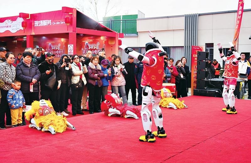 龟山电视塔新春科技庙会上,市民游客观看机器人、机器狗表演。图片来源:长江日报记者何晓刚 摄